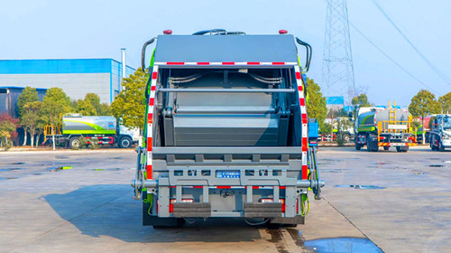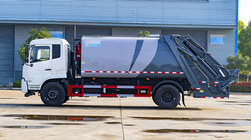 东风多利卡D9压缩式垃圾车改装容积10~12m3,选用3950和4500两种轴距底盘,箱体采用边4底5、Q235碳钢板,带有前推板和刮板,带有污水箱。双向压缩,标配带挂桶反转机构,可选其他样式后翻转。