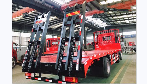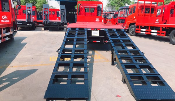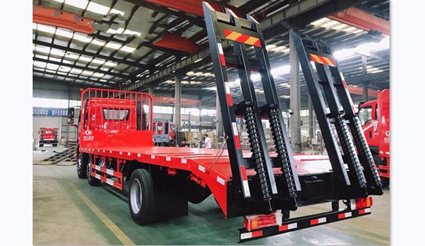 改装部分可以根据用户需要选择材料。标配横梁采用6mm厚方钢,底板采用8mm厚花纹板,可以选择加厚材料,可拉20吨挖机。可选装单节及双节液压爬梯