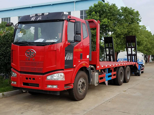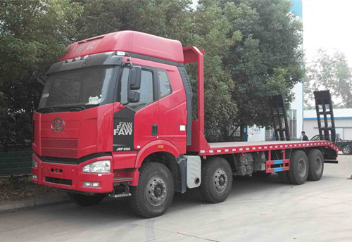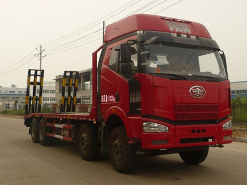 改装部分可以根据用户需要选择材料。标配横梁采用6mm厚方钢,底板采用8mm厚花纹板,可以选择加厚材料。 解放J6前四后八平板运输车可以运输35吨工程机械。厂家直销:13997882988。